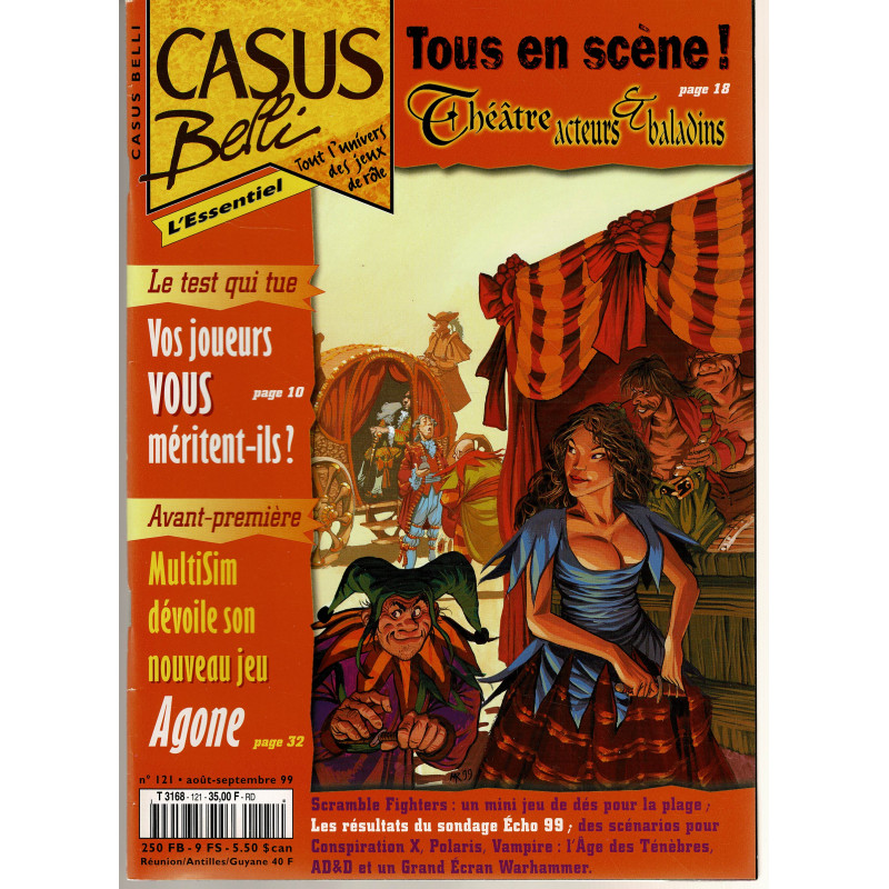 Dossier spécial sur le théâtre, les acteurs et baladins, les forains,... et un mini jeu de dés pour la plage: Scramble Fighters. Articles, critiques et/ou aides de jeu sur Agone (interview de Mathieu Gaborit), Aberrant Rpg (White Wolf), Dragonlance Classics (15th Anniversary edition), La cité des mensonges (L5A), Les Contrées du Rêve revisitées (Appel de Cthulhu), Le Livre des Fondations (Mage l'Ascension), Shadowtech (Shadowrun en VF), 7th Sea en VO, L'Université de Magie et Magie & sortilèges (AD&D),...