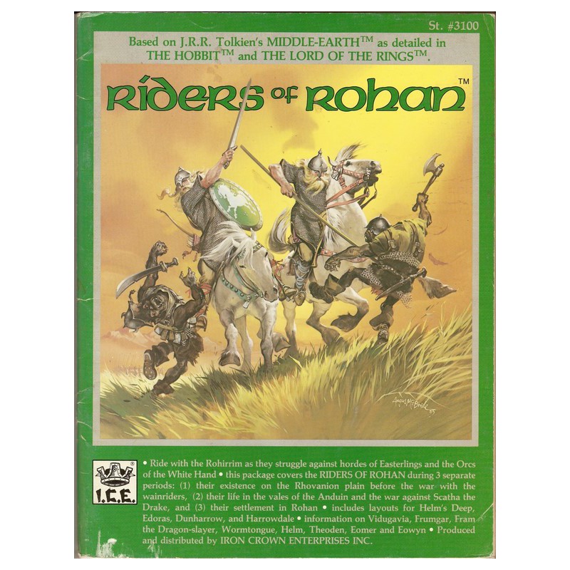 Supplément pour le Jeu de Rôle des Terres du Milieu (J.R.T.M.) ou Middle Earth Role Playing Game (MERP) des éditions Iron Crown Enterprise, Inc. Ce module comprend 6 pages de plans en couleur, les cartes en Noir et Blanc des lieux importants ou emblématiques du Rohan, une revue détaillée des seigneurs-cavaliers à travers l'histoire et des autres habitants qui peuplent la région: Dunlendings, demi-orques, les serviteurs de la Main Blanche et les Druedain.